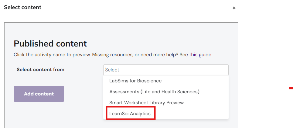 You can also add LearnSci Analytics to a course on your own VLE for easy access. The tool will automatically prevent students from accessing but it's recommended that you keep the link hidden from students to prevent any confusion.