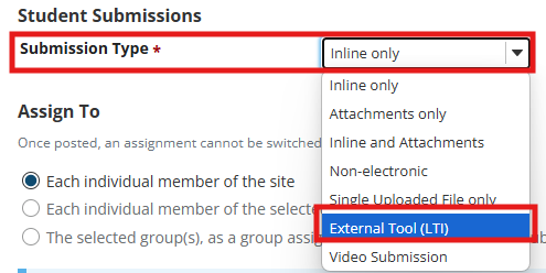 2. Add your assignment details such as the title, instructions and due date, and then in the ‘submission type’ drop down, select ‘External Tool (LTI):