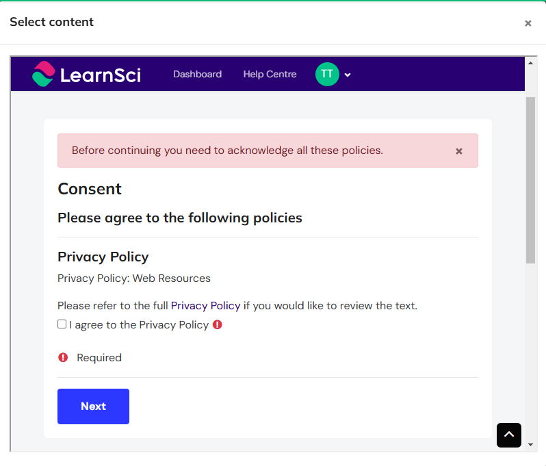 The first time you launch the new LearnSci tool, you’ll need to accept the privacy policy: